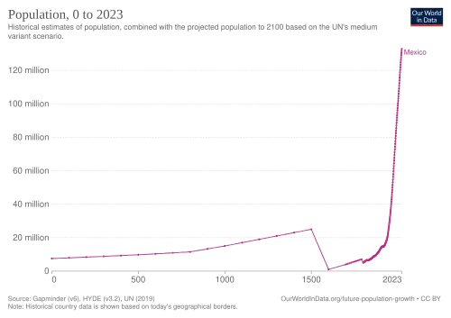 Estimates vary for the Pre-Columbian population of Mexico from 1.5 million to 21 million,[14] but the most accepted figure is about 12 million people, including the population of the Aztec Empire which is estimated at 6 million people.[15] In 1600, the population was estimated to have been around 1 to 2 million and in 1700, the population was estimated to be around 4 million. In 1900, the Mexican population was 13.6 million.[16] During the period of economic prosperity that was dubbed by economists as the "Mexican Miracle", the government invested in efficient social programs that reduced the infant mortality rate and increased life expectancy. These measures jointly led to an intense demographic increase between 1930 and 1980.