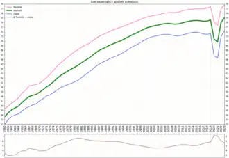 The population's annual growth rate has been reduced from a 3.5% peak in 1965 to 0.99% in 2005. While Mexico is now transitioning to the third phase of demographic transition, close to 50% of the population in 2009 was 25 years old or younger.[20] Fertility rates have also decreased from 5.7 children per woman in 1976[21] to 1.9 in 2020.[4] After decades of the gap narrowing, in 2020 the fertility rate in Mexico fell below the United States for the first time falling 22% in 2020 and a further 10.5% in the first half of 2021 due to the COVID-19 pandemic.[22] The Mexican government projects[23] that the country's population will grow to about 123 million by 2042 and then start declining slowly. Assumptions underlying this projection include fertility stabilizing at 1.85 children per woman and continued high net emigration (slowly decreasing from 583,000 in 2005 to 393,000 in 2050).