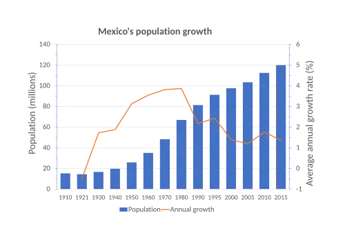 - ↑ "Tasa de crecimiento media anual de la población, 1950 a 2005". Inegi.org.mx. Archived from the original on August 27, 2018. Retrieved August 29, 2017.