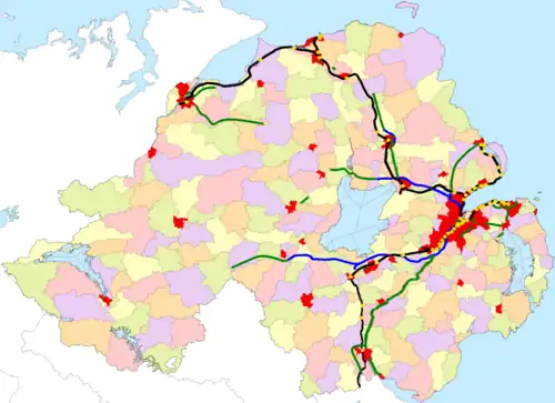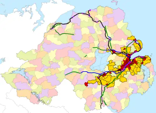 Furthermore, 50.02% of Northern Ireland's population lived in the most population-dense contiguous area of 216 electoral wards. These 216 wards have an area of 1,299 km2, 9.4% of Northern Ireland's total area. These 216 wards are highlighted in purple on the map. These wards cover part or all of the 10 largest settlements, and almost entirely track Northern Ireland's rail lines, motorways and dual carriageways. The exceptions are a spur towards Armagh city; and a string of villages between Ballymena and Limavady.