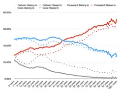 When Northern Ireland was created, it had a Protestant majority of approximately two-to-one,[2][3][4] unlike the Republic of Ireland, where Catholics were in the majority.[5] The 2001 census was the first to show that the Protestant and other (non-Catholic) Christian share of the population had dropped below 50%, but 53.1% still identified as being from a Protestant or other Christian background. In the 2011 census, this dropped to 48.4%.[6][4] In 2021, the recorded number of Catholics by background (45.7%) overtook the Protestant and other Christian by background share (43.48%), becoming the plurality, with no group in the overall majority.[7][8][9][10]