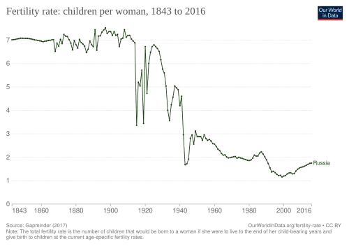 In many of the years from 1843 to 1917, Russia had the highest total fertility rate in the world.[43] These elevated fertility rates did not lead to population growth due to high mortality rate, the casualties of the Russian Revolution, the two world wars and to a lesser extent the political killings.