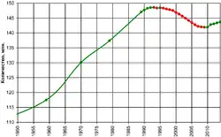 Between 1993 and 2008 there was a great decrease in the country's population from 148 to 143 million.[42] There was a huge 50% decrease in the number of births per year from 2.5 million in 1987 to 1.2 million since 1997, but the current 1.42 fertility rate is still higher than that of the 1990s.[42]