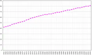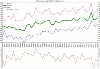 Seychelles has no indigenous population and was first permanently settled by a small group of French colonizers, Africans, and South Indians in 1770. Seychelles' modern population is composed of the descendants of French and later British colonizers, Africans, and Indian, Chinese, and Middle Eastern traders and is concentrated on three of its 155 islands – the vast majority on Mahe and lesser numbers on Praslin and La Digue. Seychelles' population grew rapidly during the second half of the 20th century, largely due to natural increase, but the pace has slowed because of fertility decline. The total fertility rate dropped sharply from 4.0 children per woman in 1980 to 1.9 in 2015, mainly as a result of a family planning program, free education and health care, and increased female labor force participation. Life expectancy has increased steadily, but women on average live 9 years longer than men, a difference that is higher than that typical of developed countries.