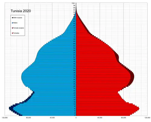 Tunisia's population was estimated to be around 12.04 million in 2022.[7] In the generally youthful African continent, Tunisia's population is among the most mature. This is because the government has supported a successful family planning program that has reduced the population growth rate to just over 1% per annum, contributing to Tunisia's economic and social stability.[8]