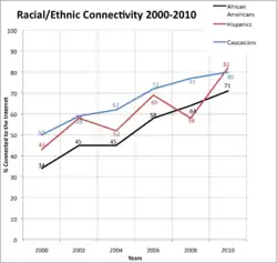 Generally, racial minorities have demonstrated lower levels of access and knowledge ICTs and of owning infrastructure to utilize the connection.[26] In 2000, 50% of Whites had access to the Internet compared to 43% of Hispanics and 34% of African Americans.[27] Between 2000 and 2010, the racial population of Internet users became increasingly similar to the racial makeup of the United States population, demonstrating a closing racial divide.[28] In 2019, 79% of Whites had access to broadband compared to 61% of Hispanics and 66% of African Americans.[20]