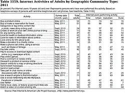 As new applications and software are developed, the Internet has increasingly become utilized to complete a variety of both professional work and personal tasks. To the right of this section are two tables describing the most recent data on the types of activities U.S. citizens utilize the Internet for compiled by the U.S. Census Bureau and presented in its final Statistical Abstract of the United States: 2012.