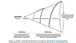Whereas disinformation research focuses primarily on how actors orchestrate deceptions on social media, primarily via fake news, new research investigates how people take what started as deceptions and circulate them as their personal views.[6] As a result, research shows that disinformation can be conceptualized as a program that encourages engagement in oppositional fantasies (i.e., culture wars), through which disinformation circulates as rhetorical ammunition for never-ending arguments.[6] As disinformation entangles with culture wars, identity-driven controversies constitute a vehicle through which disinformation disseminates on social media. This means that disinformation thrives, not despite raucous grudges but because of them. The reason is that controversies provide fertile ground for never-ending debates that solidify points of view.[6]