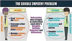 The theory of the double empathy problem is a psychological and sociological theory first coined in 2012 by Damian Milton, an autistic autism researcher.[2] This theory proposes that many of the difficulties autistic individuals face when socializing with non-autistic individuals are due, in part, to a lack of mutual understanding between the two groups, meaning that most autistic people struggle to understand and empathize with non-autistic people, whereas most non-autistic people also struggle to understand and empathize with autistic people. This lack of mutual understanding may stem from bidirectional differences in dispositions (e.g., communication style, social-cognitive characteristics), and experiences between autistic and non-autistic individuals, as opposed to always being an inherent deficit.[3]