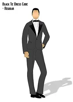 "Semi-formal" has a much less precise definition but typically means an evening jacket and tie for men (known as black tie) and a dress for women. A frilled or patterned white shirt is considered more formal than a plain white or black shirt, and a black bow tie is considered more formal than a plain black cravat, but all could be considered appropriate, depending upon the gala or wedding, when white, black, and blue were the only acceptable colors for weddings and gala events in the 20th century.