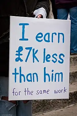 Equal pay for equal work[1] is the concept of labour rights that individuals in the same workplace be given equal pay.[1] It is most commonly used in the context of sexual discrimination, in relation to the gender pay gap. Equal pay relates to the full range of payments and benefits, including basic pay, non-salary payments, bonuses and allowances. Some countries have moved faster than others in addressing equal pay.
