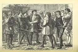 By 5 May 1517, there were over 5,000 troops in London.[15] When the prisoners had an audience with King Henry in Westminster Hall, the nobility then got on its knees to plead for a pardon for the prisoners. Henry announced the pardon after his wife, Catherine of Aragon, appealed before him to spare the lives of the rebels for the sake of their wives and children. At this the prisoners "took the halters from their necks and danced and sang".[16]