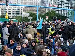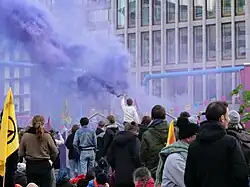 Its first major action was to occupy the London Greenpeace offices on 17 October 2018,[18] which was followed by the public launch at the "Declaration of Rebellion" on 31 October 2018 outside the UK Parliament.[14][19] Earlier that month, about one hundred academics signed a call to action in their support.[20] In November 2018, five bridges across the River Thames in London were blockaded as a protest.[21] In April 2019, Extinction Rebellion occupied five prominent sites in central London: Piccadilly Circus, Oxford Circus, Marble Arch, Waterloo Bridge, and the area around Parliament Square. In August 2021, the Impossible Rebellion targeted London.
