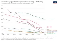 In the past, the vast majority of the world population lived in conditions of extreme poverty.[8][9] The percentage of the global population living in absolute poverty fell from over 80% in 1800 to around 10% by 2015.[10] According to UN estimates, in 2015 roughly 734 million people or 10% remained under those conditions.[11] The number had previously been measured as 1.9 billion in 1990, and 1.2 billion in 2008. Despite the significant number of individuals still below the international poverty line, these figures represent significant progress for the international community, as they reflect a decrease of more than one billion people over 15 years.[11]