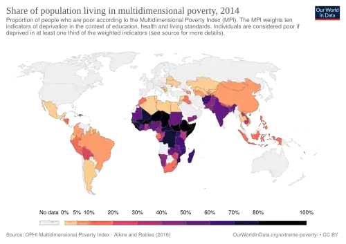 The MPI is useful for development officials to determine the most likely causes of poverty within a region, using the M0 measure of the method (which is calculated by multiplying the fraction of people in poverty by the fraction of dimensions they are deprived in).[25] For example, in the Gaza Strip of Palestine, using the M0 measure of the Alkire-Foster method reveals that poverty in the region is primarily caused by a lack of access to electricity, lack of access to drinking water, and widespread overcrowding. In contrast, data from the Chhukha District of Bhutan reveals that income is a much larger contributor to poverty as opposed to other dimensions within the region.[26] However, the MPI only presents data from 105 countries, so it cannot be used for global measurements.[27]
