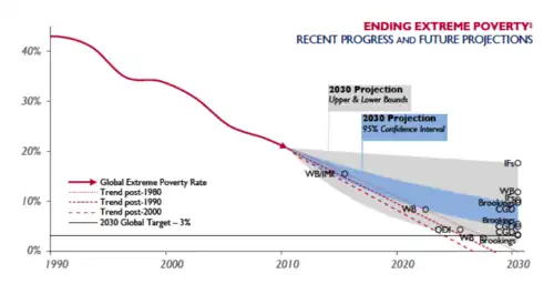 As aforementioned, the number of people living in extreme poverty has reduced from 1.9 billion to 766 million over the span of the last decades. If we remain on our current trajectory, many economists predict we could reach global zero by 2030–2035, thus ending extreme poverty. Global zero entails a world in which fewer than 3% of the global population lives in extreme poverty (projected under most optimistic scenarios to be fewer than 200 million people). This zero figure is set at 3% in recognition of the fact that some amount of frictional (temporary) poverty will continue to exist, whether it is caused by political conflict or unexpected economic fluctuations, at least for the foreseeable future.[34] However, the Brookings Institution notes that any projection about poverty more than a few years into the future runs the risk of being highly uncertain. This is because changes in consumption and distribution throughout the developing world over the next two decades could result in monumental shifts in global poverty, for better or worse.[35]