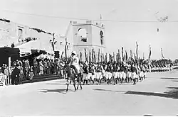 The Fascists paid special attention to the role of women, from elite society women to factory workers[70] and peasants.[71] Fascist leaders sought to "rescue" women from experiencing emancipation even as they trumpeted the advent of the "new Italian woman" (nuova italiana).[72] The policies revealed a deep conflict between modernity and traditional patriarchal authority, as Catholic, Fascist and commercial models of conduct competed to shape women's perceptions of their roles and their society at large. The Fascists celebrated violent "virilist" politics and exaggerated its machismo while also taxing celibate men to pay for child welfare programs. Italy's invasion of Ethiopia in 1935 and the resulting League of Nations sanctions shaped the tasks assigned to women within the Fascist Party. The empire and women's contribution to it became a core theme in Fascist propaganda. Women in the party were mobilized for the imperial cause both as producers and as consumers, giving them new prominence in the nation. The Fascist women's groups expanded their roles to cover such new tasks as running training courses on how to fight waste in housework. Young Italian women were prepared for a role in Italy's "place in the sun" through special courses created to train them for a future as colonial wives.[73]