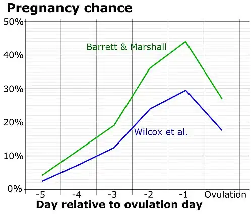 - ↑ Dunson DB, Baird DD, Wilcox AJ, Weinberg CR (July 1999). "Day-specific probabilities of clinical pregnancy based on two studies with imperfect measures of ovulation". Human Reproduction. 14 (7): 1835–1839. doi:10.1093/humrep/14.7.1835. PMID 10402400.