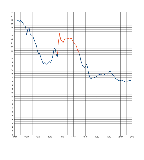 After 1940 fertility suddenly started going up again, reaching a new peak in 1957. After 1960, fertility started declining rapidly. In the Baby Boom years (1946–1964), women married earlier and had their babies sooner; the number of children born to mothers after age 35 did not increase.[63]