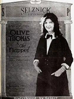 In his lecture in February 1920 on Britain's surplus of young women caused by the loss of young men in war, Dr. R. Murray-Leslie criticized "the social butterfly type... the frivolous, scantily-clad, jazzing flapper, irresponsible and undisciplined, to whom a dance, a new hat, or a man with a car, were of more importance than the fate of nations".[24] In May of that year, Selznick Pictures released The Flapper, a silent comedy film starring Olive Thomas. It was the first film in the United States to portray the "flapper" lifestyle. By that time, the term had taken on the full meaning of the flapper generation style and attitudes.