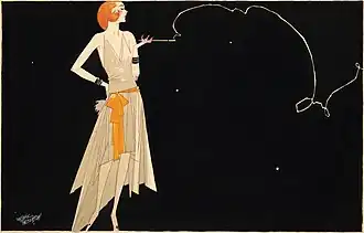 Changes in fashion were interpreted as signs of deeper changes in the American feminine ideal.[102] The short skirt and bobbed hair were likely to be used as a symbol of emancipation.[103] Signs of the moral revolution consisted of premarital sex, birth control, drinking, and contempt for older values. Before the War, a lady did not set foot in a saloon; after the War, a woman, though no more "a lady", entered a speakeasy as casually as she would go into a railroad station. Women had started swearing and smoking publicly, using contraceptives, raising their skirts above the knee and rolling their hose below it. Women were now competing with men in the business world and obtaining financial independence and, therefore, other kinds of independence from men.[101]