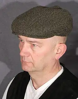 A flat cap is a rounded cap with a small stiff brim in front, originating in Northern England. The hat is also known in Ireland as a paddy cap; in Scotland as a bunnet; in Wales as a Dai cap; and in the United States as an English cap or Irish cap. Various other terms exist (scally cap,[1] cabbie cap, driver cap, golf cap,[2] longshoreman cap, ivy cap, jeff cap,[3] train engineer cap and sixpence amongst others). Flat caps are usually made of tweed, wool or cotton, while some are made using leather, linen or corduroy. The inside of the cap is commonly lined for comfort and warmth.[4]