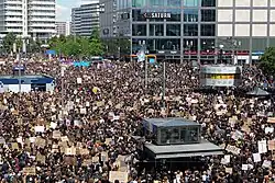 Protesters in London rallied outside the United States embassy on May 22, 2021. Protesters remarked that the Chauvin murder conviction was "a small amount of justice of what [George Floyd] really deserves". The protest was among of new set of peaceful protests in the United Kingdom to mark the one-year anniversary of Floyd's murder.[214] On May 25, 2021, protesters took the streets in Germany[215] and demonstrators took a knee in and raised their fists at rallies in Glasgow, London, and Edinburgh.[170] Rallies were held outside U.S. Embassies in Greece and Spain.[216][217]