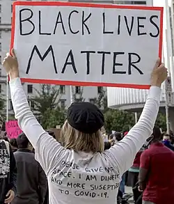The murder of George Floyd sparked mass protests and calls for police reform in the face of ongoing police violence against African-Americans. Large companies such as Nike and Walmart aimed to express their support for the movement through branding themselves as antiracist. Despite some politicians expressing backlash for the Black Lives Matter protests, politicians such as Republican Senator Mitt Romney participated.[74] The movement sought to express their understanding of police brutality as a result of anti-black sentiment, which is seen as structural in nature.[75]
