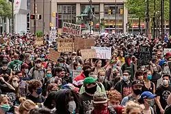 The George Floyd protests were a series of protests and demonstrations against police brutality that began in Minneapolis in the United States on May 26, 2020.[7][8] The protests and civil unrest began in Minneapolis as reactions to the murder of George Floyd, a 46-year-old unarmed African American man, by city police during an arrest. They spread nationally and internationally. Veteran officer Derek Chauvin was recorded as kneeling on Floyd's neck for 9 minutes and 29 seconds; Floyd complained of not being able to breathe,[9] but three other officers looked on and prevented passersby from intervening.[16] Chauvin and the other three officers involved were fired and later arrested.[17] In April 2021, Chauvin was found guilty of second-degree murder, third-degree murder, and second-degree manslaughter.[18] In June 2021, Chauvin was sentenced to 22+1⁄2 years in prison.[19]