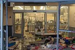 Protests were held at several locations throughout the Minneapolis–Saint Paul metropolitan area in subsequent days. The situation escalated the nights of May 27 to 29 where widespread arson, rioting, and looting took place, which were noted as a contrast to daytime protests that were characterized as mostly peaceful events.[100] Some initial acts of property destruction on May 27 by a 32-year-old man with ties to white supremacist organizations, who local police investigators said was deliberately inciting racial tension, led to a chain reaction of fires and looting.[102] The unrest, including people overtaking the Minneapolis third precinct police station and setting it on fire the night of May 28, garnered significant national and international media attention.[99][103] After state officials mobilized Minnesota National Guard troops in its largest deployment since World War II,[104][105] the violent unrest subsided and mostly peaceful protests resumed.[99] However, the violence by early June 2020 had resulted in two deaths,[106][107] 604 arrests,[108][109] an estimated $550 million[5] in property damage to 1,500 locations, making the Minneapolis–Saint Paul events alone the second-most destructive period of local unrest in United States history, after the 1992 Los Angeles riots.[110][111][112][109] About 60% of the local financial losses were uninsured.[113]