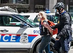 Multiple police officers were shot or attacked during the protests.[268] Four officers were shot in St. Louis after facing violent protesters who had been looting and vandalising local businesses.[269] In Las Vegas, a policer officer was shot in the head at Circus Circus Hotel and Casino whilst they were fighting a suspect.[270] Law enforcement officers were also injured by vehicles in Denver and New York City and hit by projectiles elsewhere in the U.S.A.[268] In New York City, nearly 400 officers were injured following two weeks of protesting. Injuries resulted from being hit by moving vehicles and being hit in the head with objects such as bricks and bottles.[271] In one incident in Los Angeles, two officers were shot whilst sitting in their patrol car and protesters blocked the responding ambulance from entering the hospital whilst shouting "we hope they die".[272] In London, protesters threw objects at police, and picked up and threw temporary barriers at the gates of Downing Street where officers were stationed prompting more officers to enter the area.[273] In all, twenty-seven officers were injured in London,[274] with fourteen officers injured when protesters clashed with mounted police, with Metropolitan Police Commissioner Cressida Dick saying it was "shocking and completely unacceptable".[275][276]