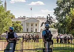 On June 4, federal agencies added about 1.7 miles (2.7 km) of fencing around the White House, Lafayette Square, and The Ellipse.[231] Protesters used the fencing to post signs and artwork expressing their views.[232] On June 11, the fencing was taken down, and some signs were collected by Smithsonian Museum curators from the National Museum of African American History and Culture.[233] U.S. Customs and Border Protection, authorized to provide aerial surveillance "to assist law enforcement and humanitarian relief efforts" when requested, provided drone imagery during the protests.[234][235]