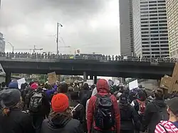A larger demonstration was organized and held on May 30 at Westlake Park, joined by thousands from a protest at police headquarters,[14] and evolved into a standoff between protesters and police, leading to acts of looting and arson in Seattle, among them the Nordstrom flagship store. Protesters also blocked Interstate 5 in both directions.[14]