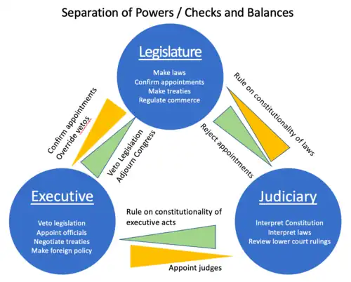 Governments are often organised into three branches with separate powers: a legislature, an executive, and a judiciary; this is sometimes called the trias politica model. However, in parliamentary and semi-presidential systems, branches of government often intersect, having shared membership and overlapping functions. Many governments have fewer or additional branches, such as an independent electoral commission or auditory branch.[41]
