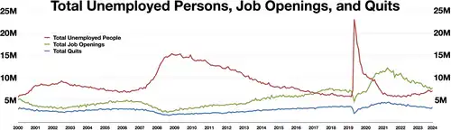 By March 2023, the Great Resignation showed signs of petering out with fewer people quitting their positions as the job market became more competitive. Employers no longer needed to offer as many benefits in order to fill vacancies.[90] Wage growth has slowed.[91] The retail and hospitality industries saw quit rates returning to pre-pandemic levels. Many workers were actually working two jobs in order to make ends meet or because they are anxious about the state of the economy.[92] Although unemployment remains under four percent and job growth continues to be positive,[91] fears of a possible recession and improved working conditions have prompted many employees to stay where they are, leading to a drop in the monthly rate of quitting.[32] By July 2023, there were signs that of significant expansion of the U.S. labor force thanks to women of prime working age, disabled people, and immigrants (both legal and illegal) seeking employment.[93] Economist Anthony Klotz indicated in February 2023 that the quit rate has fallen as if the pandemic never happened. However, he noted that the health care, retail, transportation and industries were still facing a labor shortage,[32] and that 2019 still saw a historically high rate of quitting.[33] Nevertheless, by the end of 2023, the balance of power in the job market has shifted in favor of employers as hiring cooled and fewer vacancies were available.[94] As 2024 began, layoffs picked up pace, though not to the level that would pose problems for the economy at large. Demand for labor remained strong as the U.S. economy continued to see net job gains.[95]