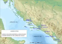 - ↑ Cabanes, Pierre (2008). "Greek Colonisation in the Adriatic". In Tsetskhladze, Gocha R. (ed.). Greek Colonisation: An Account of Greek Colonies and Other Settlements Overseas. Vol. 2. Brill. p. 271. ISBN 9789047442448.