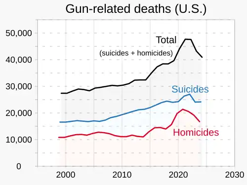 Gun violence in the United States results in tens of thousands of deaths and injuries annually.[107] In 2013, there were 73,505 nonfatal firearm injuries (23.2 injuries per 100,000 U.S. citizens),[108][109] and 33,636 deaths due to "injury by firearms" (10.6 deaths per 100,000 U.S. citizens).[110] These deaths consisted of 11,208 homicides,[111] 21,175 suicides,[110] 505 deaths due to accidental or negligent discharge of a firearm, and 281 deaths due to firearms use with "undetermined intent".[110] Of the 2,596,993 total deaths in the US in 2013, 1.3% were related to firearms.[107][112] The ownership and control of guns are among the most widely debated issues in the country.
