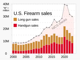 - ↑ ● Gun sale data from Brownlee, Chip (December 31, 2023). "Gun Violence by the Numbers in 2023". The Trace. Archived from the original on 2024-01-28.