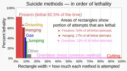 There is a strong relationship between guns in the home, as well as access to guns more generally, and suicide risk, the evidence for which is strongest in the United States.[24][25] In 2017, almost half of the nation's 47,173 suicides involved a firearm.[26] A 1992 case-control study conducted in Tennessee and Washington found that individuals in a firearm owning home are close to five times more likely to commit suicide than those individuals who do not own firearms.[27] A 2002 study found that access to guns in the home was associated with an increased risk of suicide among middle-aged and older adults, even after controlling for psychiatric illness.[28] As of 2008, there were 12 case-control studies that had been conducted in the U.S., all of which had found that guns in the home were associated with an increased risk of suicide.[29] However, a 1996 New Zealand study found no significant relationship between household guns and suicide.[30] Assessing data from 14 developed countries where gun ownership levels were known, the Harvard Injury Control Research Center found statistically significant correlations between those levels and suicide rates. However, the parallels were lost when data from additional nations was included.[31]: 30 A 2006 study found a significant effect of changes in gun ownership rates on gun suicide rates in multiple Western countries.[32] During the 1980s and 1990s, the rate of adolescent suicides with guns caught up with adult rates, and the 75-and-older rate rose above all others.[10]: 20–21 [33] A 2002 study found that 90% of suicide attempts with firearms were successful.[34]