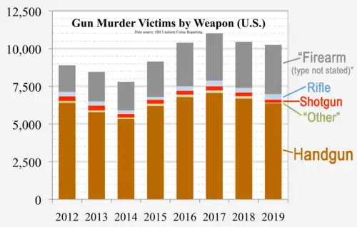 In 2010, 67% of all homicides in the U.S. were committed using a firearm.[113] In 2012, there were 8,855 total firearm-related homicides in the US, with 6,371 of those attributed to handguns.[114] In 2012, 64% of all gun-related deaths in the U.S. were suicides.[115] In 2010, there were 19,392 firearm-related suicides, and 11,078 firearm-related homicides in the U.S.[116] In 2010, 358 murders were reported involving a rifle while 6,009 were reported involving a handgun; another 1,939 were reported with an unspecified type of firearm.[117]