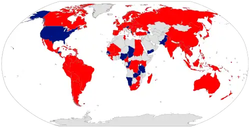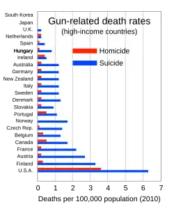 The United States has the 11th highest rate of gun violence in the world and a gun homicide rate which is 25 times higher than the average respective rates of other high income nations.[7][8] The United States has a total rate of firearms death which is many times higher than that of similarly developed nations with strict gun control laws, such as Japan, Australia, the United Kingdom, and South Korea.[8] Nearly all studies have found a positive correlation between gun ownership and gun-related homicide and suicide rates.[9][10]: 29 [11]