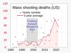 The definition of a mass shooting remains under debate. The precise inclusion criteria are disputed, and there no broadly accepted definition exists.[158][159] Mother Jones, using their standard of a mass shooting where a lone gunman kills at least four people in a public place for motivations excluding gang violence or robbery,[160] concluded that between 1982 and 2006 there were 40 mass shootings, an average of 1.6 per year. From 2007 to May 2018, there were 61 mass shootings, an average of 5.4 per year.[161] More broadly, the frequency of mass shootings steadily declined throughout the 1990s and early 2000s, then increased dramatically.[162][163]