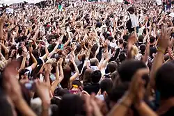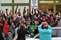 The phrase became a rallying cry for protesters and others trying to draw attention to the killing of Brown and other African Americans by police officers. In November 2014, some members of the St. Louis Rams ran out on the field during pregame introductions with their hands raised above their heads, an action repeated by four members of the Congressional Black Caucus on the House floor in December 2014.[26] The hybrid slogan "Hands Up, Don't Shoot" quickly spread beyond the Ferguson protests. It was often said in solidarity with the protesters in Ferguson.[27][28][29][30]