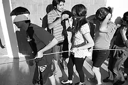 Tied and blindfolded first-year students from Universidad de Talca, Chile