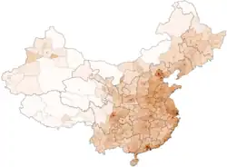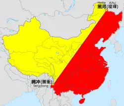 The Heihe–Tengchong Line (simplified Chinese: 黑河–腾冲线; traditional Chinese: 黑河–騰衝線; pinyin: Hēihé–Téngchōng xiàn), also called the Aihui-Tengchong Line (and internationally as the Hu line), is an imaginary line that divides the area of China into two parts with contrasting population densities. It stretches from the city of Heihe in the northeast to Tengchong in the south, diagonally across China. The eastern portion, area shown in red in the map, is further subdivided into north and south halves.