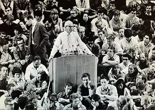 Marcuse's critiques of capitalist society (especially his 1955 synthesis of Marx and Sigmund Freud, Eros and Civilization, and his 1964 book One-Dimensional Man) resonated with the concerns of the student movement in the 1960s because of his willingness to speak at student protests and his essay "Repressive Tolerance" (1965).[9] He had been given the title "Philosopher of the New Left" for his rejection of the traditions of Western civilization. The New Left provided an attractive alternative to American society and Marcuse was able to appeal to many young individuals through his teachings of utopianism. His ideas critiqued contemporary liberalism and its conservative vestiges of nineteenth-century liberalism.[15] Marcuse then soon became known in the media as "Father of the New Left."[9][16] Contending that the students of the '60s were not waiting for the publication of his work to act,[16] Marcuse brushed the media's branding of him as "Father of the New Left" aside lightly,[16] saying: "It would have been better to call me not the father, but the grandfather, of the New Left."[16] His work strongly influenced intellectual discourse on popular culture and scholarly popular culture studies. In particular, he influenced youth because he "spoke their language."[16] He understood the importance of rock and roll,[16] for example, as a symbol for New Left activism. He had many speaking engagements in the US and Western Bloc in the late 1960s and 1970s. He became a close friend and inspirer of the French philosopher André Gorz.