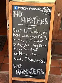 Fixed-gear bicycles are associated with the hipster subculture. Slate calls the bikes an "increasingly common hipster accessory."[26][27] An association of hipsters with an increasing popularity of full beards dates from before 2010.[24][28][29][30] In 2016, historian Alun Withey remarked that "The hipster beard, or lumberjack beard, is going to be the defining facial hair of this generation."[31] The undercut hairstyle also became popular among hipsters in the 2010s. Other hipster trends in the 2010s have included knitting, photography, horticulture, urban beekeeping, specialty coffee, craft beer, taxidermy,[32] fedoras,[33] and printing and bookbinding classes.[34]