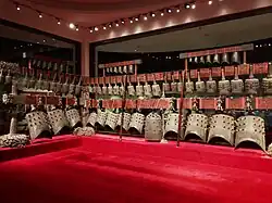 By the mid-13th century BCE, the Late Shang dynasty had developed writing, which mostly exists as divinatory inscriptions on the ritualistic oracle bones but also as bronze inscriptions.[73][74] As many as 11 oracle script characters may refer to music to some extent, some of which could be iconographical representations of instruments themselves.[75] The stone bells qing appears to have been particularly popular with the Shang ruling class,[n 11] and while no surviving flutes have been dated to the Shang,[77] oracle script evidence suggests they used ocarinas (xun), transverse flute (xiao and dizi), douple pipes, the mouthorgan (sheng), and maybe the pan flute (paixiao).[78][n 12] Due to the advent of the bronze in 2000 BCE,[80] the Shang used the material for bells—the ling (鈴), nao (鐃) and zhong (鐘)[59]—that can be differentiated in two ways: those with or without a clapper and those struck on the inside or outside.[81] Drums, which are not found from before the Shang,[82] sometimes used bronze, though they were more often wooden (bangu).[83][59][n 13] The aforementioned wind instruments certainly existed by the Zhou dynasty (1046–256 BCE), as did the first Chinese string instruments: the qin (or guqin) and se zithers.[59][n 14] The Zhou saw the emergence of major court ensembles and the well known Tomb of Marquis Yi of Zeng (after 433 BCE) contains a variety of complex and decorated instruments.[59] Of the tomb, the by-far most notable instrument is the monumental set of 65 tuned bianzhong bells, which range five octaves requiring at least five players; they are still playable and include rare inscriptions on music.[86]