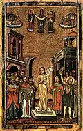 Like their Western counterparts of the same period, Byzantine composers were primarily men.[147] Kassia is a major exception to this; she was a prolific and important composer of sticheron hymns and the only woman whose works entered the Byzantine liturgy.[148] A few other women are known to have been composers, Thekla, Theodosia, Martha and the daughter of John Kladas (her given name is unrecorded).[149][150] Only the latter has any surviving work, a single antiphon.[151] Some Byzantine emperors are known to have been composers, such as Leo VI the Wise and Constantine VII.[152][153]