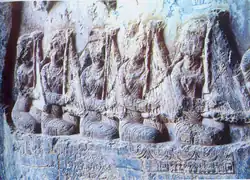 In general, it is impossible to create a thorough outline of the earliest music in Persia due to a paucity of surviving records.[116] Evidenced by c. 3300–3100 BCE Elam depictions, arched harps are the first affirmation of Persian music, though it is probable that they existed well before their artistic depictions.[117] Elamite bull lyres from c. 2450 have been found in Susa, while more than 40 small Oxus trumpets have been found in Bactria and Margiana, dated to the c. 2200–1750 Bactria–Margiana Archaeological Complex.[118][n 20] The oxus trumpets seem to have had a close association with both religion and animals; a Zoroastrian myth in which Jamshid attract animals with the trumpet suggests that the Elamites used them for hunting.[119] In many ways the earliest known musical cultures of Iran are strongly connected with those of Mesopotamia. Ancient arched harps (c. 3000) also exist in the latter and the scarcity of instruments makes it unclear as to which culture the harp originated.[117] Far more bull lyres survive in Ur of Mesopotamia, notably the Bull Headed Lyre of Ur, though they are nearly identical to their contemporary Elamite counterparts.[120] From the evidence in terracotta plaques, by the 2nd-century BCE the arched harp was displaced by the angular harps, which existed in 20-string vertical and nine-string horizontal variants.[121] Lutes were purportedly used in Mesopotamia by at least 2300 BCE, but not until c. 1300 BCE do they appear in Iran, where they became the dominant string instruments of Western Iran, though the available evidence suggests its popularity was outside of the elite.[122] The rock reliefs of Kul-e Farah show that sophisticated Persian court ensembles emerged in the 1st-century BCE, in the which the central instrument was the arched harp.[123] The prominence of musicians in these certain rock reliefs suggests they were essential in religious ceremonies.[124]